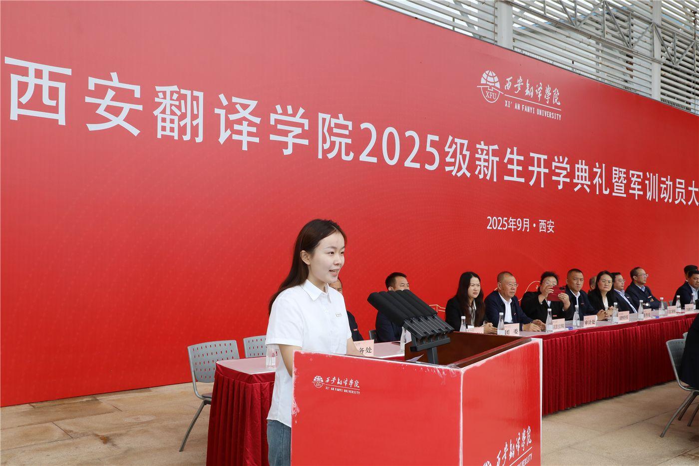 文学与传媒学院柳一婷作为在校生代表分享了自己在西译的成长经历,呼吁新生怀揣理想、脚踏实地,夯实学业、投身实践、常怀感恩,在“读书、做人、变革、奋进”的校训中书写青春,以谦虚、勤奋、善良和担当,为母校争光、为祖国奉献。